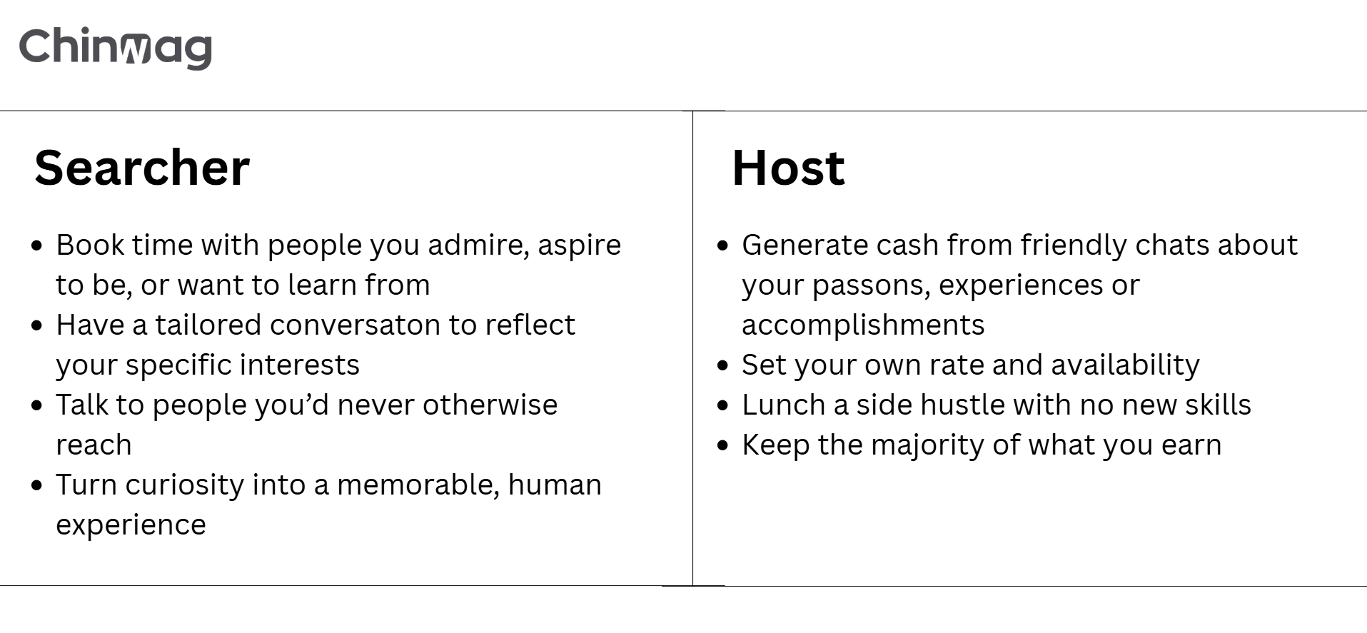 Chinwag is a new two-sided video marketplace where anybody can create a personal profile and sell their time online. Our core belief is that everyone has something they can talk about well along with an interesting story to tell.